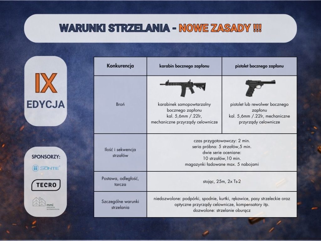 IX Edycja, to również nowe rozdanie Ligi Bocznego Zapłonu. Przygotowaliśmy dla Was 5 rund oraz strzelamy z pistoletu (tradycyjnie) oraz karabinka minirifle (zatem możecie zabrać swoje cudeńka i przy okazji się nimi pochwalić).